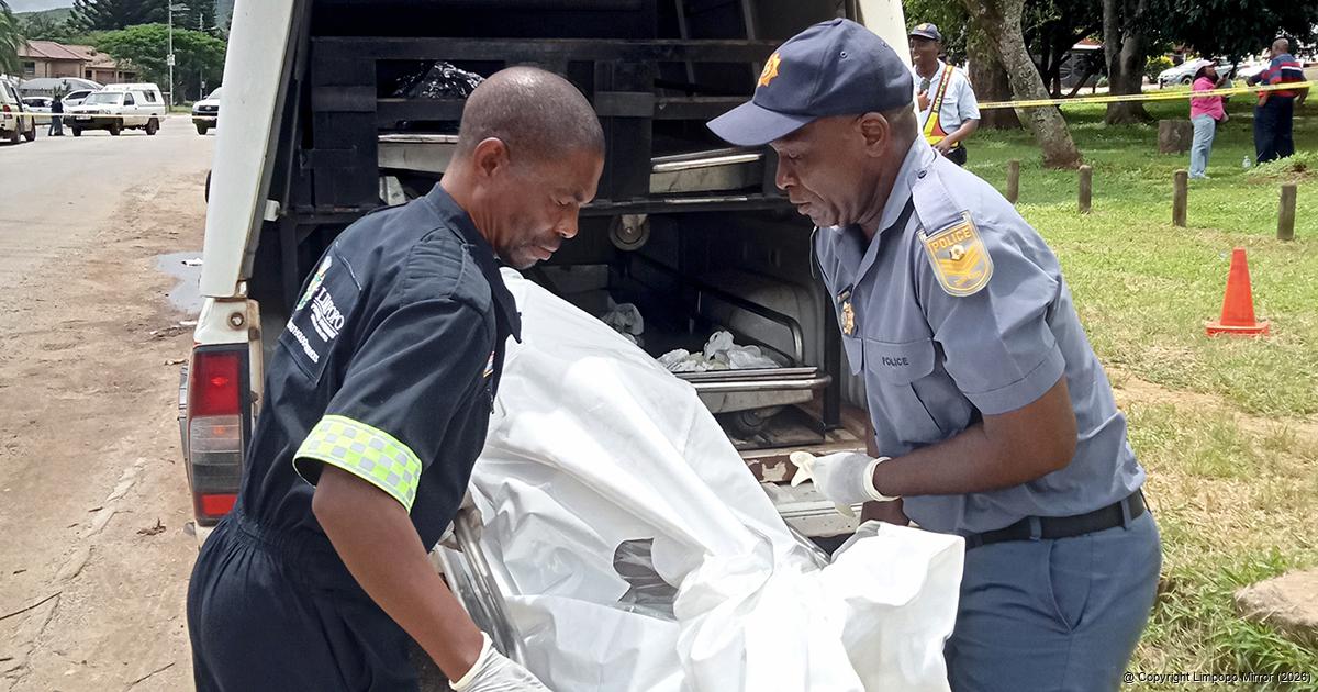 Members of the police's forensic unit in the process of loading the deceased into their vehicle at the scene. Photo: Kaizer Nengovhela.